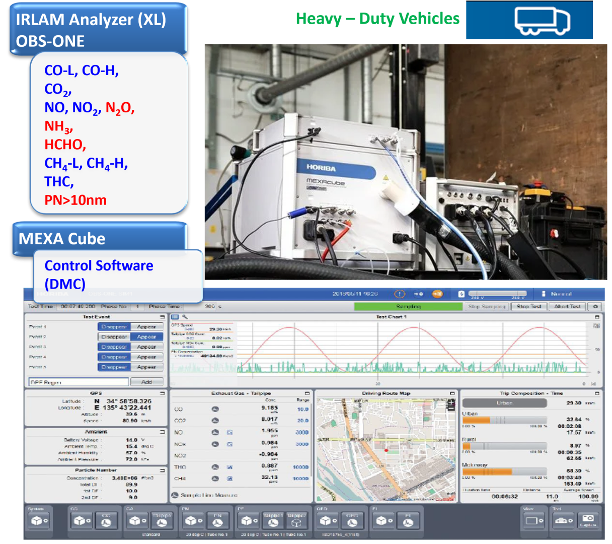 MEXAcube (IRLAM Analyzer (XL)) measures a comprehensive range of emission concentrations, including CO, CO2, NO, NOx, NO2, N2O, NH3, HCHO, CH4, by using QCL-IR (quantum cascade laser infrared spectroscopy) and THC by using FID (flame ionization detection) principles. It also monitors air-to-fuel ratio, exhaust flow rate, GPS data, and environmental conditions while calculating mass emissions. The accompanying Data Post Processing (PP) software performs basic calculations such as mass emissions and fuel consumption. Additionally, it enables regulation-based analysis and reporting, enhancing the analyzer’s utility in various applications.