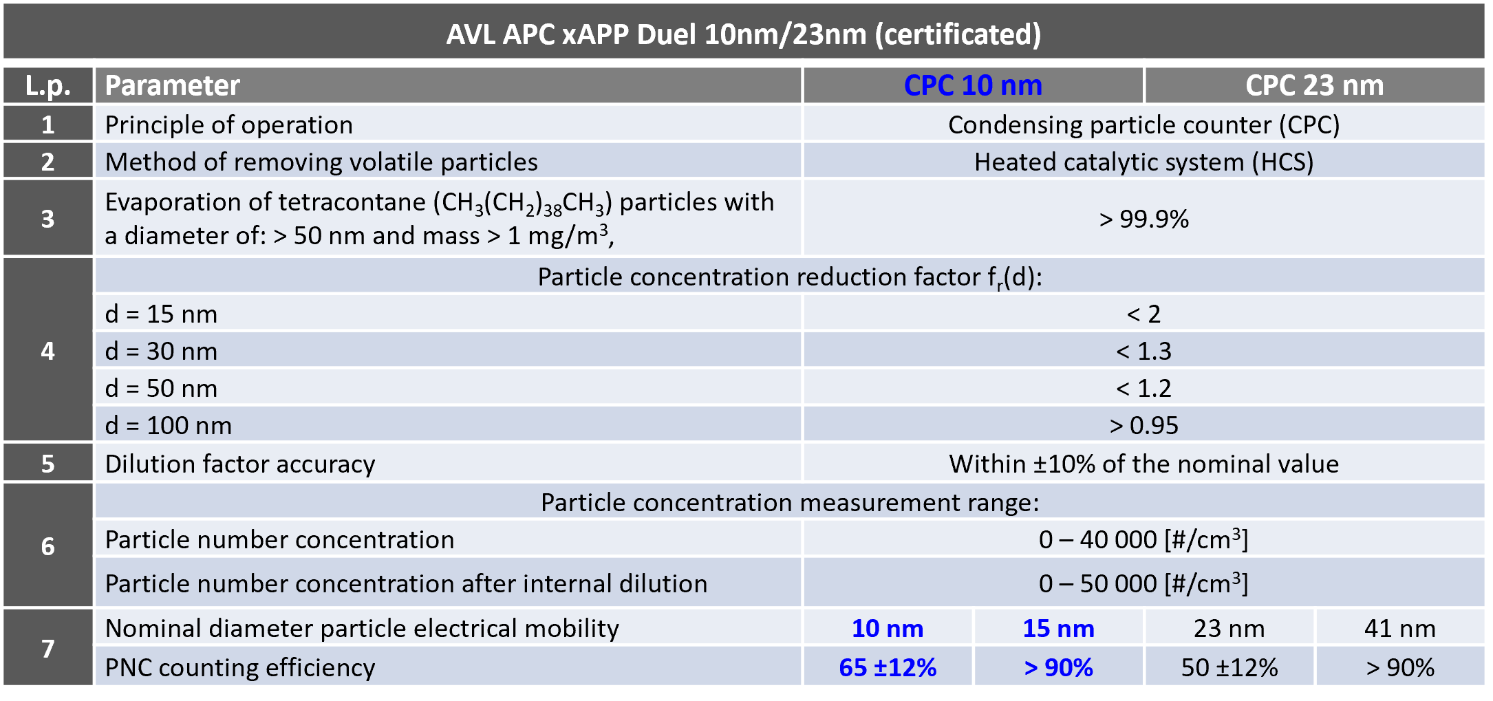 emissions. The APC xApp 10/23™ fulfill the specifications according to the draft requirements GTR15 10nm for sub-23nm emission measurements as proposed by the UNECE PMP Group. Parallel measurement of 10nm and 23nm provide valuable data for actual and future PN specifications.