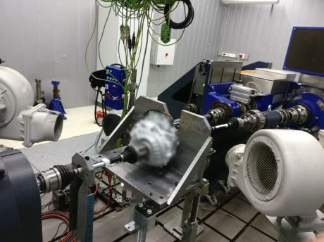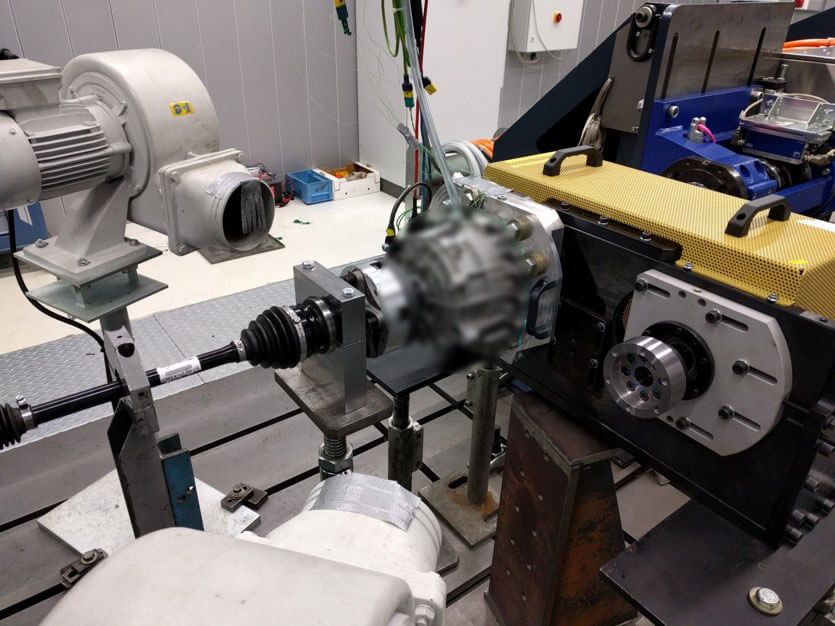 This battery emulator, which is integrated into the transmission test stand, enables testing to be carried out on complete electric drive axles (engine, gearbox, inverter, semi-axles) and hybrid transmissions with transverse engine mounting, including under simulated operating conditions (simulation of the vehicle and its battery, as well as the road and the driver).